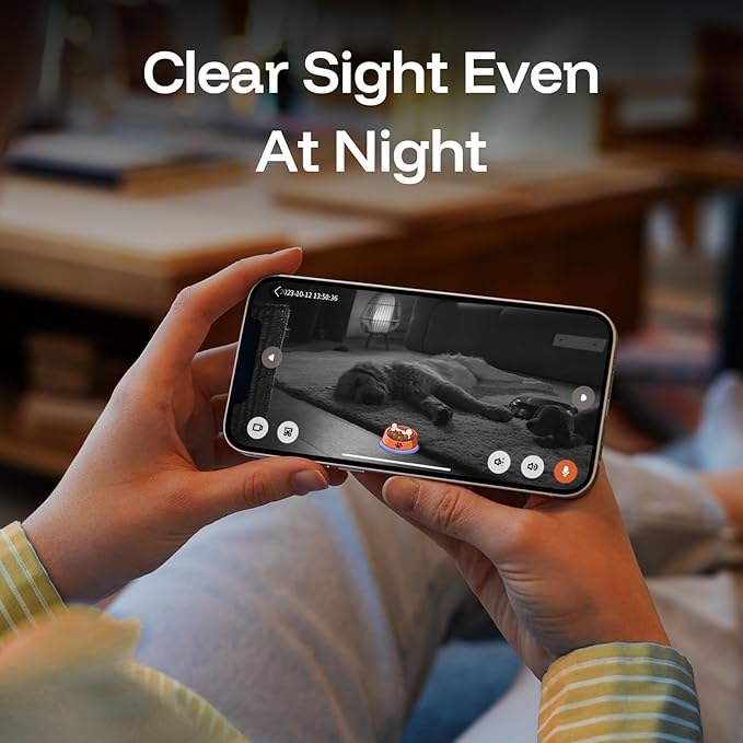 - Smart Treat Launch System: The pet camera built in 0.5L capacity treat dispenser. Remotely toss 7-15mm snacks via phone app to relieve separation anxiety and stay connected with your furry friend even when you're away.