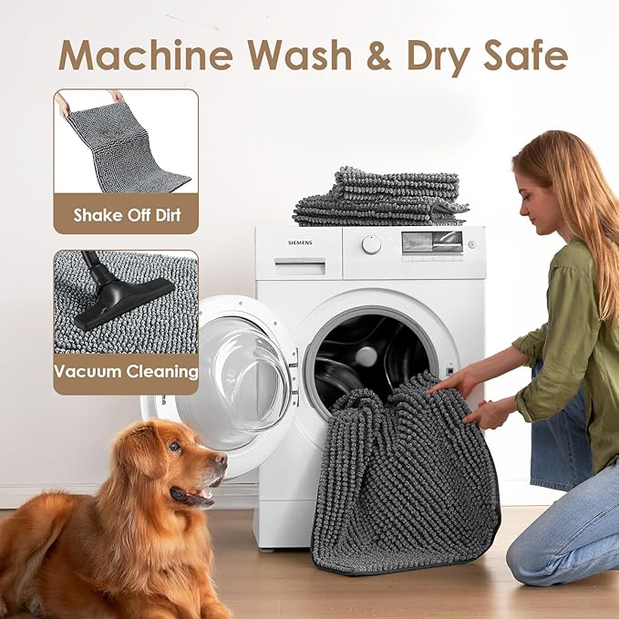 - [Super Absorbent Muddy Paws Rescue Mat] Tired of soggy floors? Our thick high-low pile chenille fibers trap moisture and dirt on contact, absorbing up to 5x its weight. Place it at front door entrances, mudrooms, or patios to keep muddy paws, wet boots, and tracked-in water at bay. Completely machine washable for easy cleanup in any busy household!