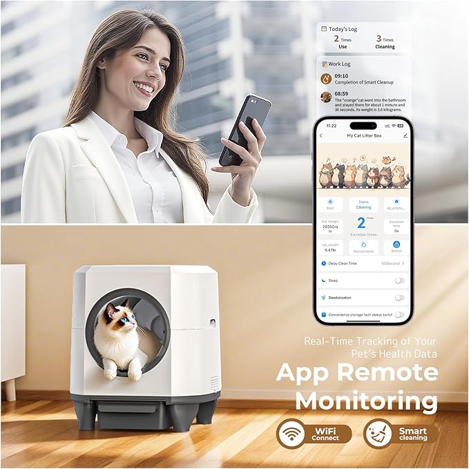 - App Control Litter Box:This app control smart litter box lets you check your cat’s bathroom activity in real time—whether you’re at work, traveling, or relaxing in another room. Keep your pet’s litter box fresh and clean without being there in person.