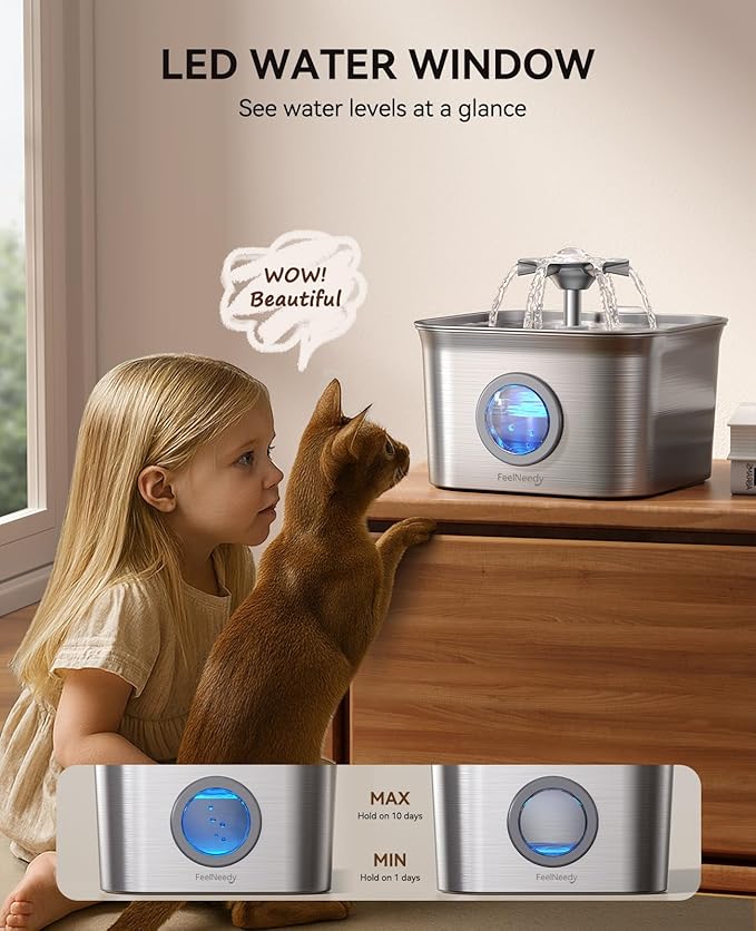Stainless Steel Cat Water Fountain for Drinking with 3 Filters, 2.8L Auto Pet Drinking Fountain for Cats with 20dB Ultra-Quiet Pump, 24/7 Circulation Filtration LED Water Level Window Dishwasher Safe