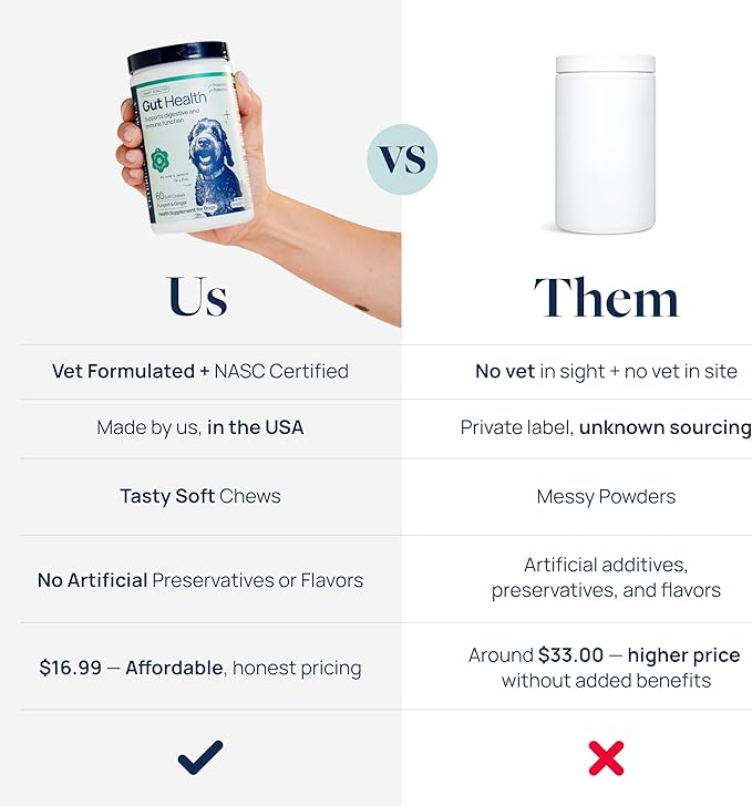 - VET-FORMULATED & TASTY CHEWS – These pork-flavored gut health chews are vet-formulated and made without artificial flavors or preservatives. No powders or messy pastes — just one easy-to-give chew per day.