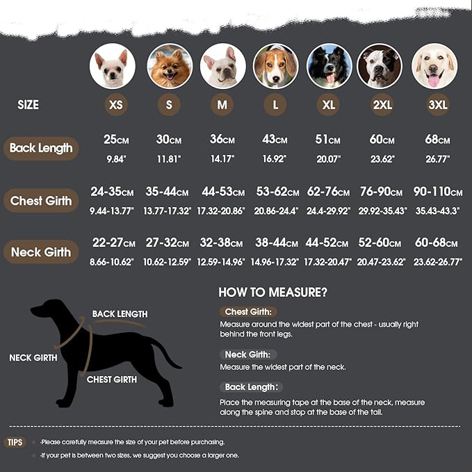 - SIZE INQUIRY: If you don't make sure which size to choose, you can measure your dog firstly then contact us for a recommended size. We are pleased to help you to choose a suitable dog coat for your furry friend.
