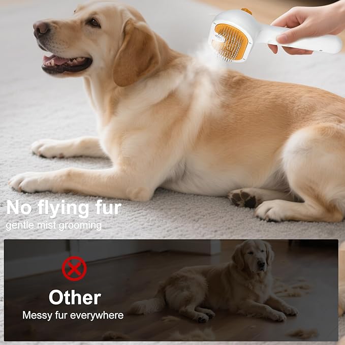 - Multi-Function Dog Steam Brush for Shedding & Hair Removal: This pet steam brush combines de-shedding, steam spray, self-cleaning, and massage into one tool. It effectively removes loose fur from your dog or cat, reducing tangles and matting while keeping their coat smooth and soft. Perfect for long haired pets, it meets all daily grooming needs and helps reduce bathing frequency.
