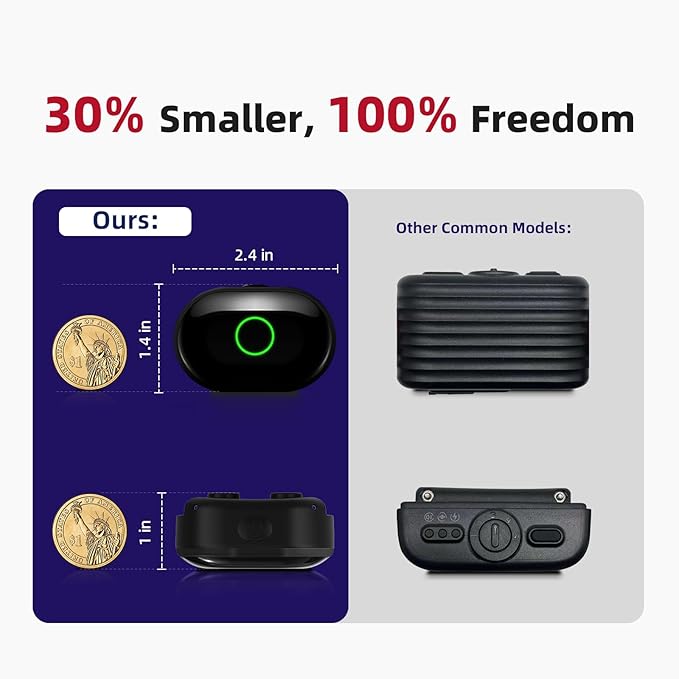 - 【Compact & Lightweight for All Sizes dogs】Measuring just 2.4×1.4×1 inch,smaller and lighter. Which can fit 10-120lbs dogs with neck sizes from 6-22 inches. The sleek, modern design reduces the social stigma often associated with shock collars, making walks and training sessions more relaxed.