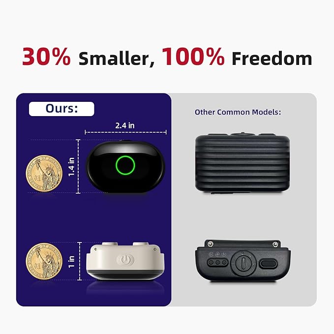 - 【Compact & Lightweight for All Sizes dogs】Measuring just 2.4×1.4×1 inch,smaller and lighter. Which can fit 10-120lbs dogs with neck sizes from 6-22 inches. The sleek, modern design reduces the social stigma often associated with shock collars, making walks and training sessions more relaxed.