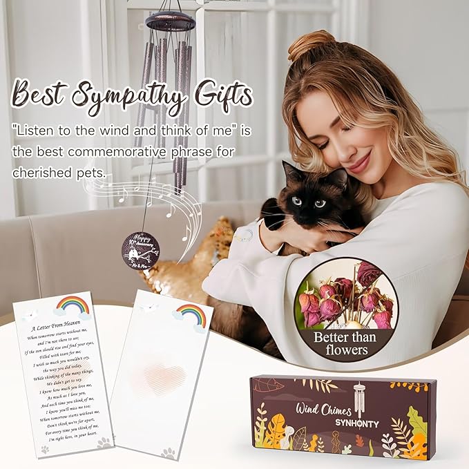 - 【25 Inch Memorial Wind Chimes】Cat memorial gift comes with sentimental motifs on both sides and is beautifully presented in a box made with natural craftsmanship. Packaged and protected by an elegant gift box, Cat memorial gifts hangs wind chimes high as a sign of hope and remembrance.