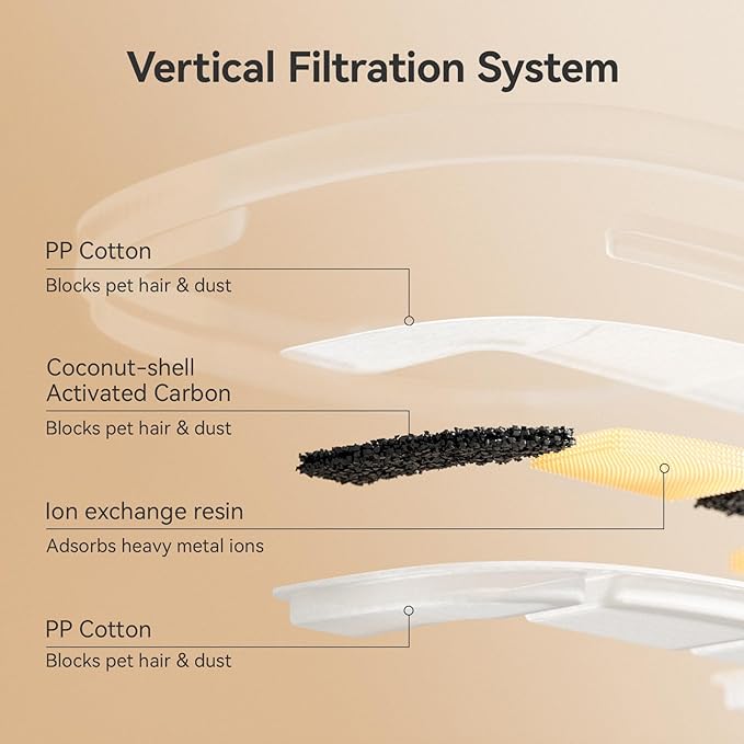 - Advanced Multiple Filtration System: The water fountain for cats features a 3-layer bigger filter that purifies every drop in this cat drinking fountain. Designed specifically as a pet water fountain accessory, it removes hair, heavy metals, and odors, helping prevent urinary diseases and support long-term pet health. (It is best to change the filter every 2-4 weeks)