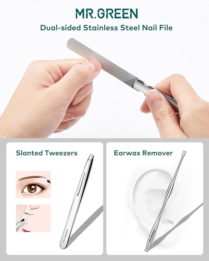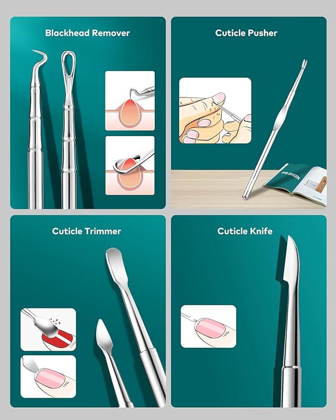 - Multi-functional Care: Perfect for nail care, facial grooming, and personal hygiene. From trimming thick toenails and shaping eyebrows to removing cuticles, blackheads, and nose hair, this grooming kit meets both everyday and professional needs.