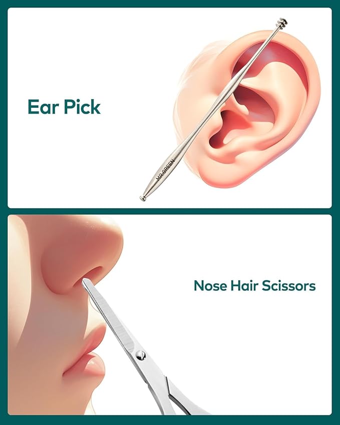 - 8-in-1 Professional Nail Care Kit Includes: Splash-Proof Large Nail Clipper, Medium Straight Nail Clipper, Slant Edge Nail Clipper, Heavy-duty Toenail Clipper, Cuticle Scissors, Ear Pick Tool, Cuticle Pusher, Nail File. Designed to meet your daily needs for hand, foot, and facial grooming.