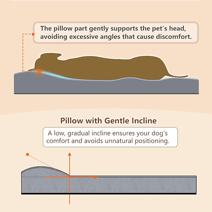 - 【Low Gentle Slope Pillow】: At one end of the bed, it is not a higher pillow, but a carefully designed low gentle slope pillow that gently bears / supports: Naturally conforms to the dog's neck curve, softly lifts the head, reducing the pressure borne by the cervical spine during daily activities and sleep. Especially more friendly to senior dogs. Prevents uncomfortable postures caused by overly large angles.