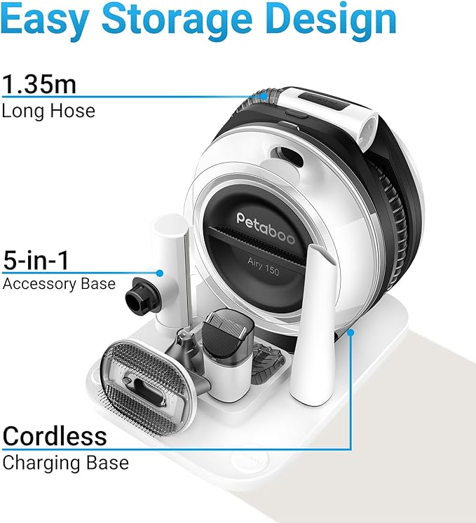 - 【Cordless Freedom & All-in-One Storage】:Say goodbye to tangled cords! Our cordless dog grooming vacuum features wireless charging and a built-in hose storage design, letting you groom anywhere—home, car, or travel—with no setup hassle. The 2.2L dust cup collects 99.99% of pet hair directly, while the compact kit organizes all 5 tools (clippers, nail grinder, brushes) in one sleek unit,no more messy