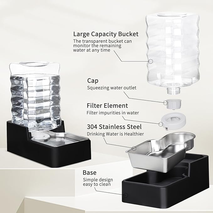 - Gravity Feed & Automatic Refilling: The efficient gravity-feed design ensures that the stainless steel bowl automatically refills to the optimal water level as your pet drinks. This prevents spills, and the proper water level also allows your pet to drink in a more comfortable position. With continuous hydration without the need for daily refills, you'll never have to worry about your pet running out of water while you're away.