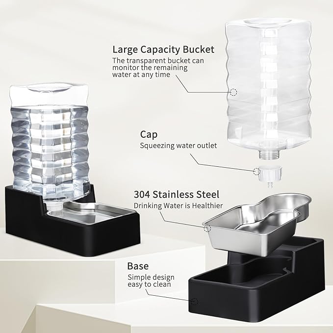 - Gravity Feed & Automatic Refilling: The efficient gravity-feed design ensures that the stainless steel bowl automatically refills to the optimal water level as your pet drinks. This prevents spills, and the proper water level also allows your pet to drink in a more comfortable position. With continuous hydration without the need for daily refills, you'll never have to worry about your pet running out of water while you're away.