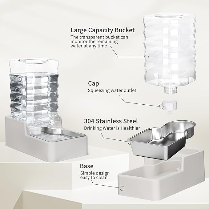 - Gravity Feed & Automatic Refilling: The efficient gravity-feed design ensures that the stainless steel bowl automatically refills to the optimal water level as your pet drinks. This prevents spills, and the proper water level also allows your pet to drink in a more comfortable position. With continuous hydration without the need for daily refills, you'll never have to worry about your pet running out of water while you're away.
