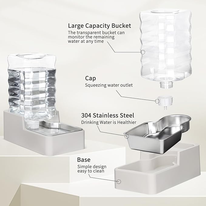 - Gravity Feed & Automatic Refilling: The efficient gravity-feed design ensures that the stainless steel bowl automatically refills to the optimal water level as your pet drinks. This prevents spills, and the proper water level also allows your pet to drink in a more comfortable position. With continuous hydration without the need for daily refills, you'll never have to worry about your pet running out of water while you're away.