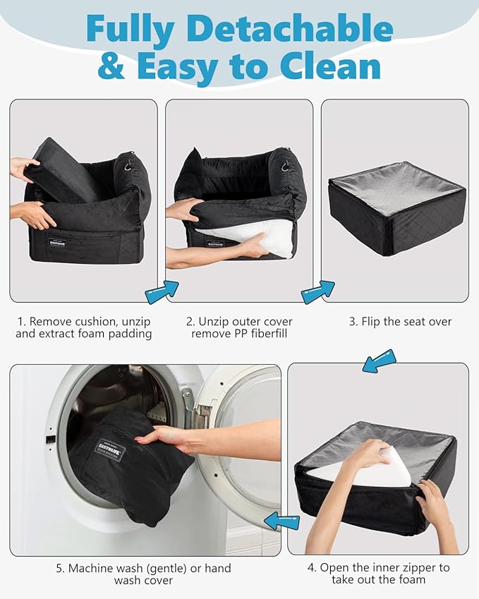 - Easy to Clean: Our dog car seat booster features a fully detachable, machine-washable cover for effortless maintenance. Simply unzip to detach the fabric (note: memory foam and PP cotton inserts should not be washed). The quick-release design keeps your car dog seat fresh and clean between adventures