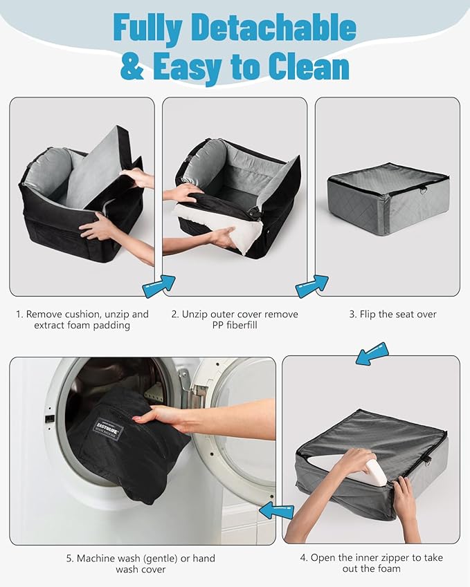 - Easy to Clean: Our dog car seat booster features a fully detachable, machine-washable cover for effortless maintenance. Simply unzip to detach the fabric (note: memory foam and PP cotton inserts should not be washed). The quick-release design keeps your car dog seat fresh and clean between adventures