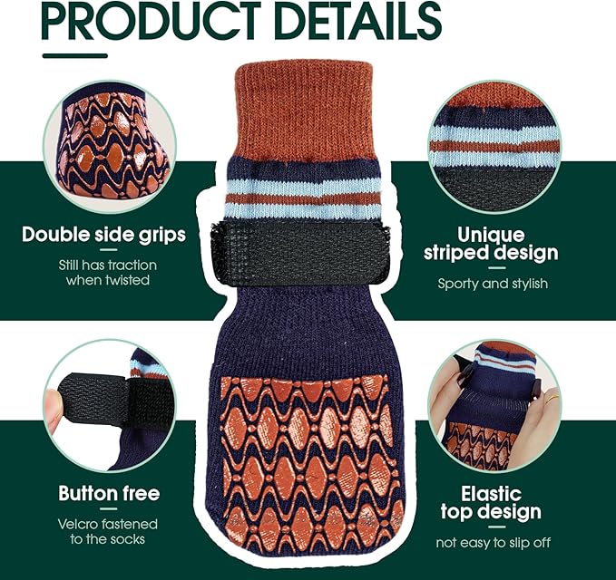 - Anti-Slip Design for Indoor & Outdoor Safety: These non slip dog socks for hardwood floors are designed with double-sided rubber grippers to enhance traction and prevent slipping on tile, laminate, or hardwood surfaces. Perfect dog grippy socks for senior dogs with mobility issues or recovering from injuries