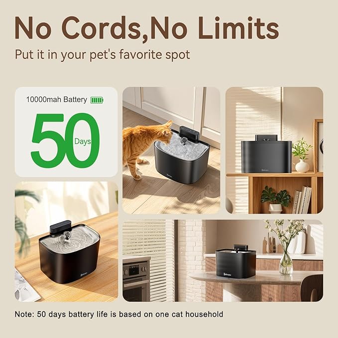 - 【Exceptional Battery Life】With its built-in 10,000mAh rechargeable battery, the Bellkaspet M1 Pro wireless cat water fountain ensures your pets stay hydrated with fresh, filtered water—even during power outages or when you're away for short trips. No more worrying about your furry friends going thirsty!