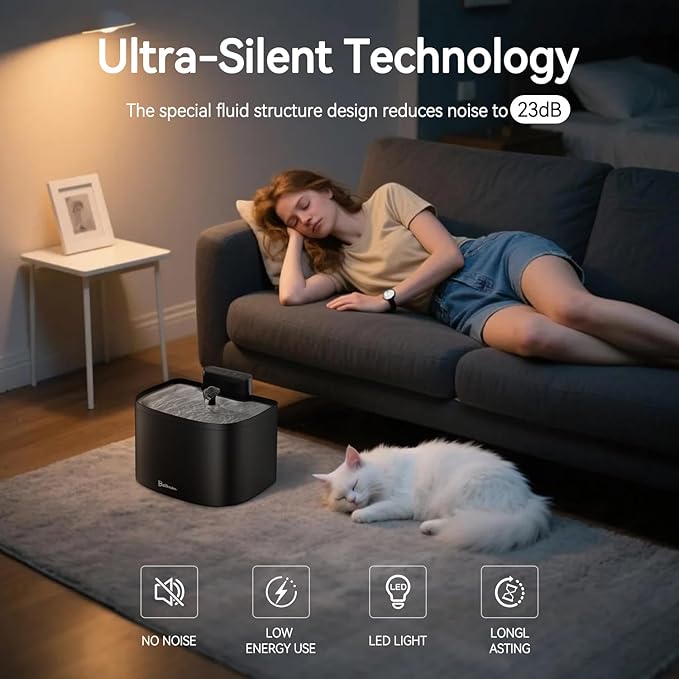 - 【Ultra-quiet and stainless steel tray】advanced fluid structure and pump-free design reduce noise by up to 23dB, allowing your cats and dogs to sleep peacefully even when nearby. The body is made of BPA-free ABS plastic materials, paired with a 304 stainless steel tray to Keep cats and dogs healthy.