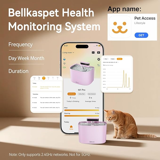 - 【Smart App Monitoring】Smart App Monitoring: 24/7 Pet Hydration Tracker – Keep your pet healthy with real-time tracking of their water intake! The BellkasPet app provides instant hydration logs to monitor drinking frequency, duration, and volume,alerts for low water level and low battery,along with AI-generated weekly & monthly insights to analyze your pet's hydration habits. Smart reminders ensure you never forget to change the water filter or clean the fountain, helping your furry friend stay hydrated effortlessly! Note: The indoor cat water fountain is compatible with 2.4GHz Wi-Fi networks only (5GHz not supported).