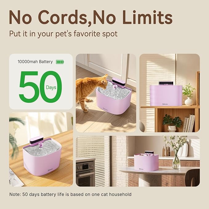 - 【Battery Operated Cat Water Fountain】Give your pets fresh, filtered water anytime, anywhere. The pumpless desgin and charging base are completely cord-free, eliminating stray electrical currents in the water so your pets can drink safely and comfortably.