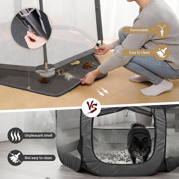 - 【Discreet Zipper, Easy Wash】Our indoor dog playpen has a discreet bottom zipper (a major upgrade from basic pet pens). Just unzip to remove the bottom panel and toss it in the wash — perfect for puppy food spills, whelping stains, or dust. Keeps your pet’s space fresh without the hassle.