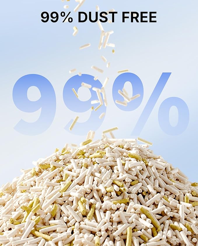 - Dust Free & Low Tracking: cat litter is ideal for cats and owners who suffer from allergies with 99.9% dust-free and hypoallergenic litter formulation. Effectively protects the cats from respiratory and liver problems. The large granules of tofu litter reduce adherence to your cat's paws, helps kitty paws & floors stay clean.