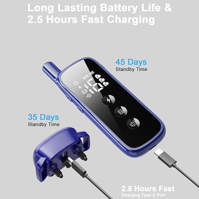 - Quick Charging: aikko training collar with remote features fast USB Type-C charging, reaching full charge in 2.5 hours. The receiver offers up to 35 days of standby time, while the remote extends to 45 days.