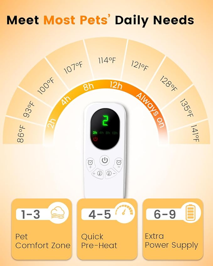 - 9 Heating Levels and 5 Timer Modes - This pet heating pad features most popular temperatures and timer modes to meet most pets' daily needs. With an intuitive interface and clear visual feedback, adjusting settings is effortless