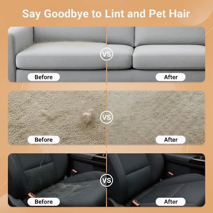 - Double-Sided Efficiency for Faster Cleaning: Double-sided design boosts efficiency—slide left/right, loose fur rolls into neat peelable strips. Fits both hands, no mess/floating fuzz—perfect for quick home or car pet hair cleanups