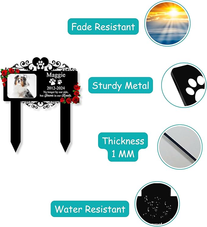 - DURABLE PET MEMORIALS: Crafted from durable metal, these pet grave markers are designed to resist rust, withstand harsh weather, and prevent fading, ensuring a lasting memorial for your cherished pet.