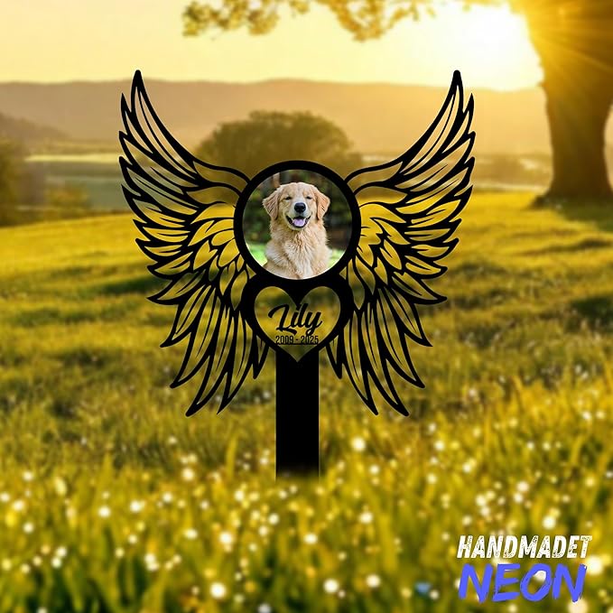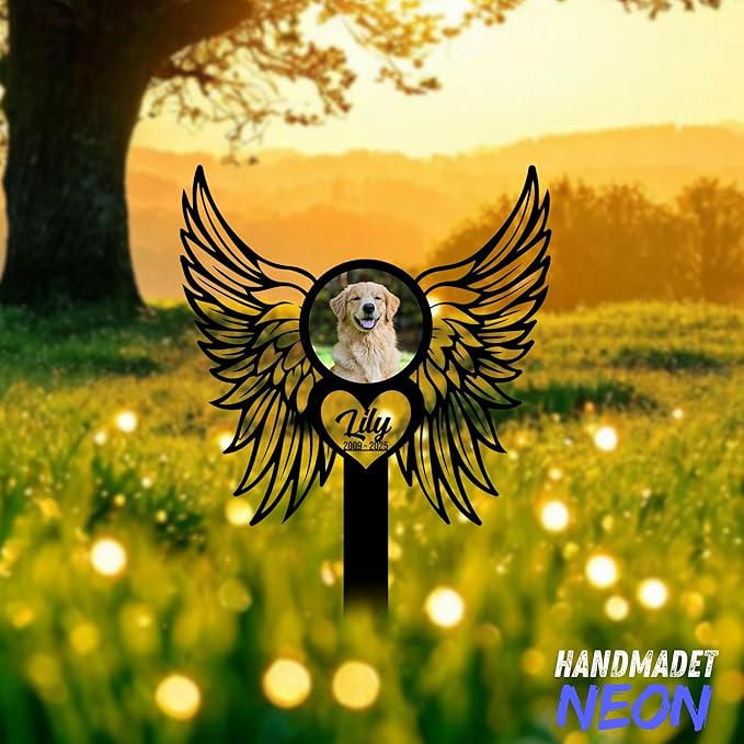 Personalized Dog Memorial Angel Wings Garden Stake with Photo, Custom Picture UV Printed Metal Grave Marker, Image in Loving Memory Outdoor Pet Loss Sympathy Gifts for Dogs Lover
