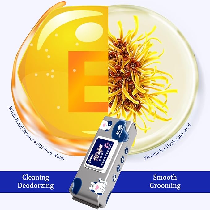 - 【Safe Formula for Pets】:Pet cleaning wipes made with EDI-purified water with the US Pharmacopoeia, hyaluronic acid, vitamin E and witch hazel extract. It can quickly gentle effective remove stubborn secretions and odors, and moisturize and smooth the fur.Using natural extracts and plant-based ingredients, it is mild, non-irritating and hypoallergenic.